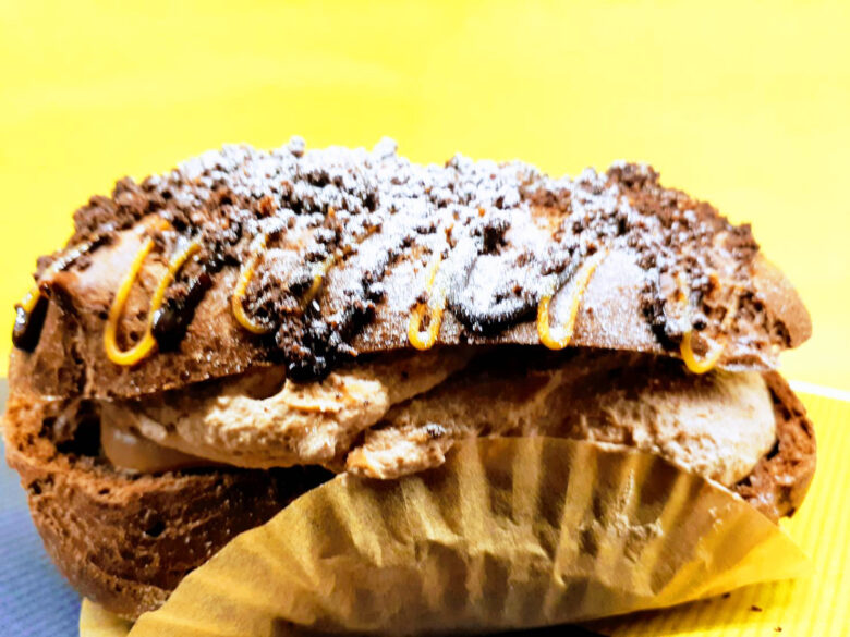 ココアのシュー生地でチョコカスタードと生クリームをサンド。チョコレート好きに大人気。
