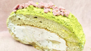 抹茶とサクラのロールケーキ 520円しっとりサクラのシフォン生地とさくらあんねクリーム、ほろ苦い抹茶のクリームを組み合わせました。